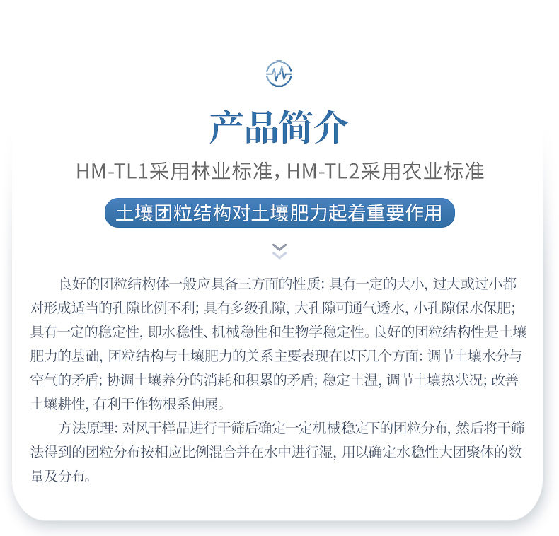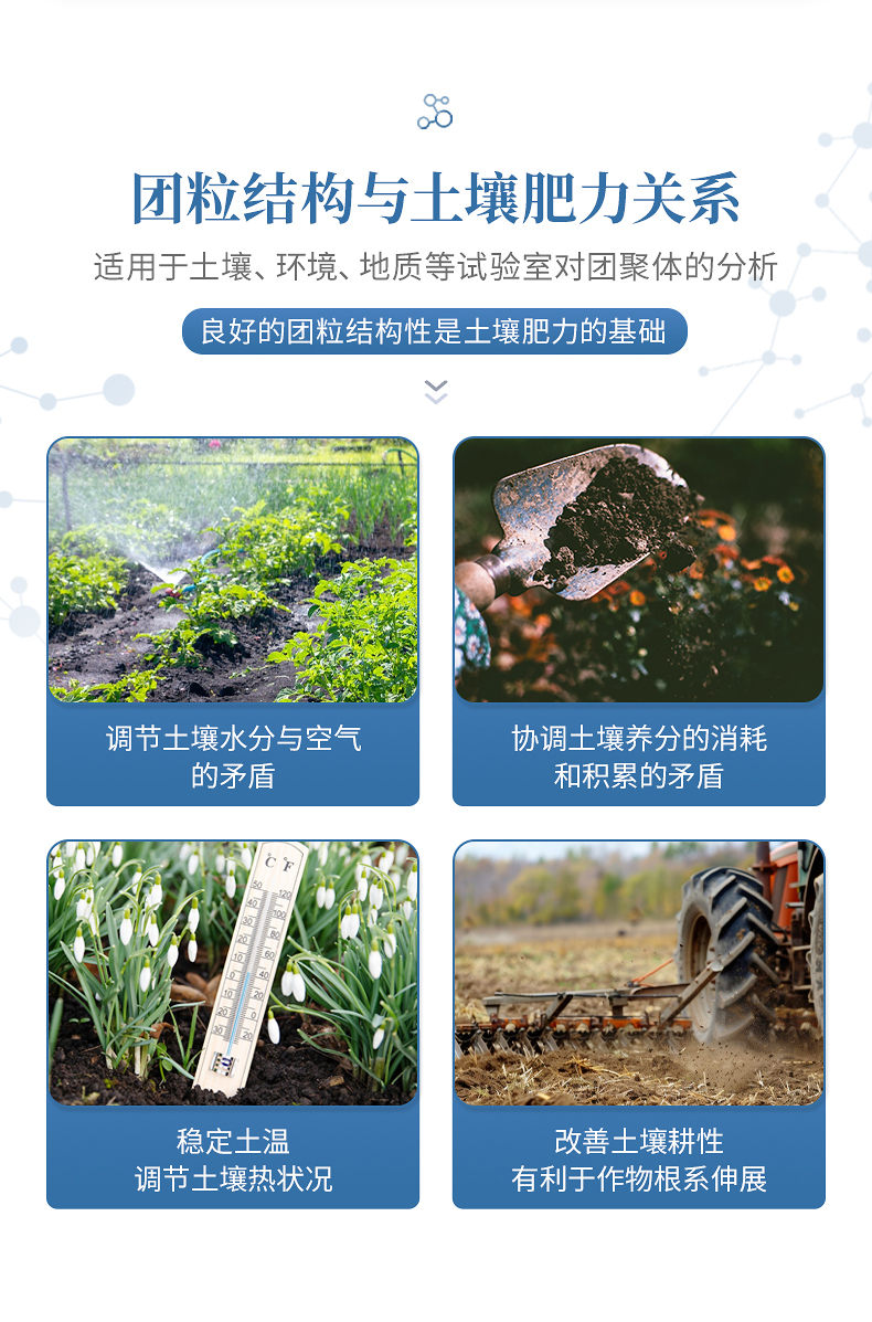 1、土壤團粒結構對土壤肥力起著重要作用。良好的團粒結構體一般應具備三方面的性質:具有一定的大小,過大或過小都對形成適當?shù)目紫侗壤焕?具有多級孔隙,大孔隙可通氣透水,小孔隙保水保肥;具有一定的穩(wěn)定性,即水穩(wěn)性、機械穩(wěn)性和生物學穩(wěn)定性。良好的團粒結構性是土壤肥力的基礎,團粒結構與土壤肥力的關系主要表現(xiàn)在以下幾個方面:調節(jié)土壤水分與空氣的矛盾;協(xié)調土壤養(yǎng)分的消耗和積累的矛盾;穩(wěn)定土溫,調節(jié)土壤熱狀況;改善土壤耕性,有利于作物根系伸展。土壤團粒分析儀適用于土壤、環(huán)境、地質等試驗室對團聚體的分析。